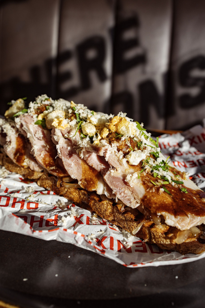 Homemade pork belly, served on sourdough bread, with cabbage, mustard, horseradish and pickles. Can be made gluten-free.